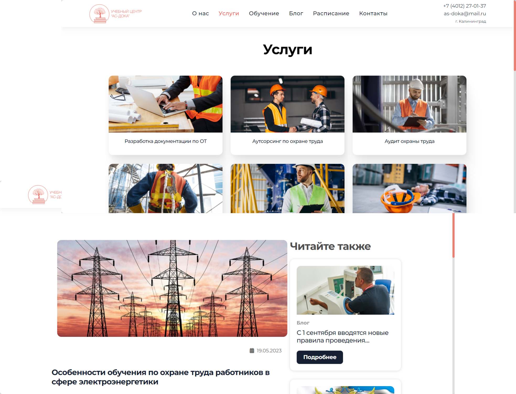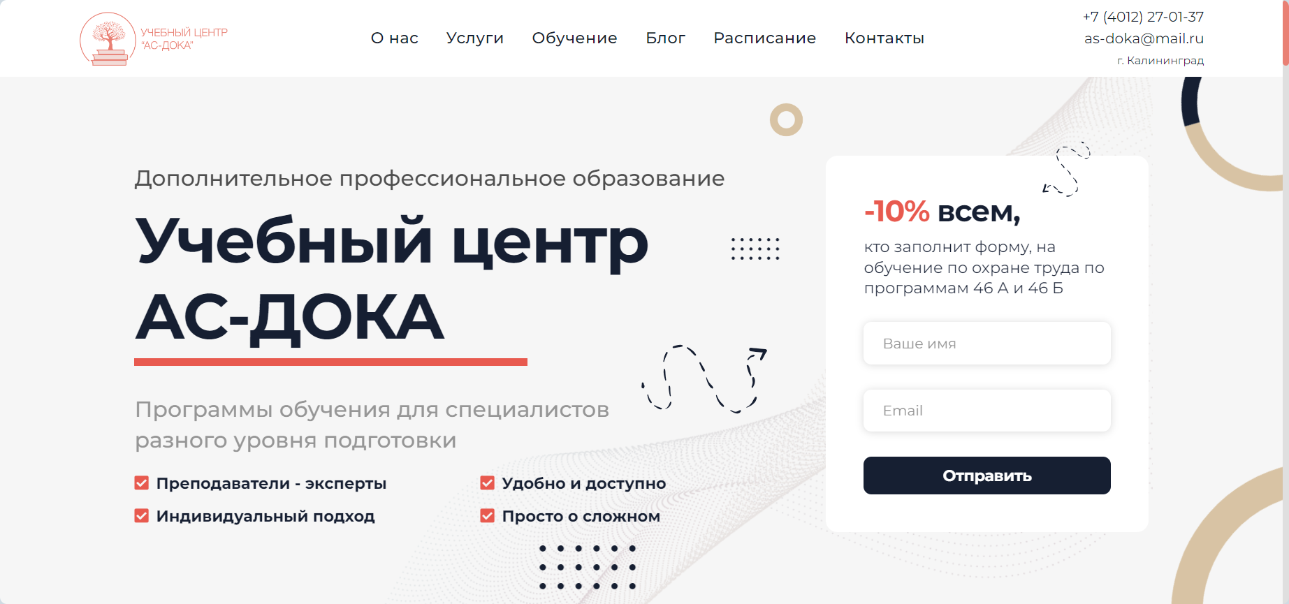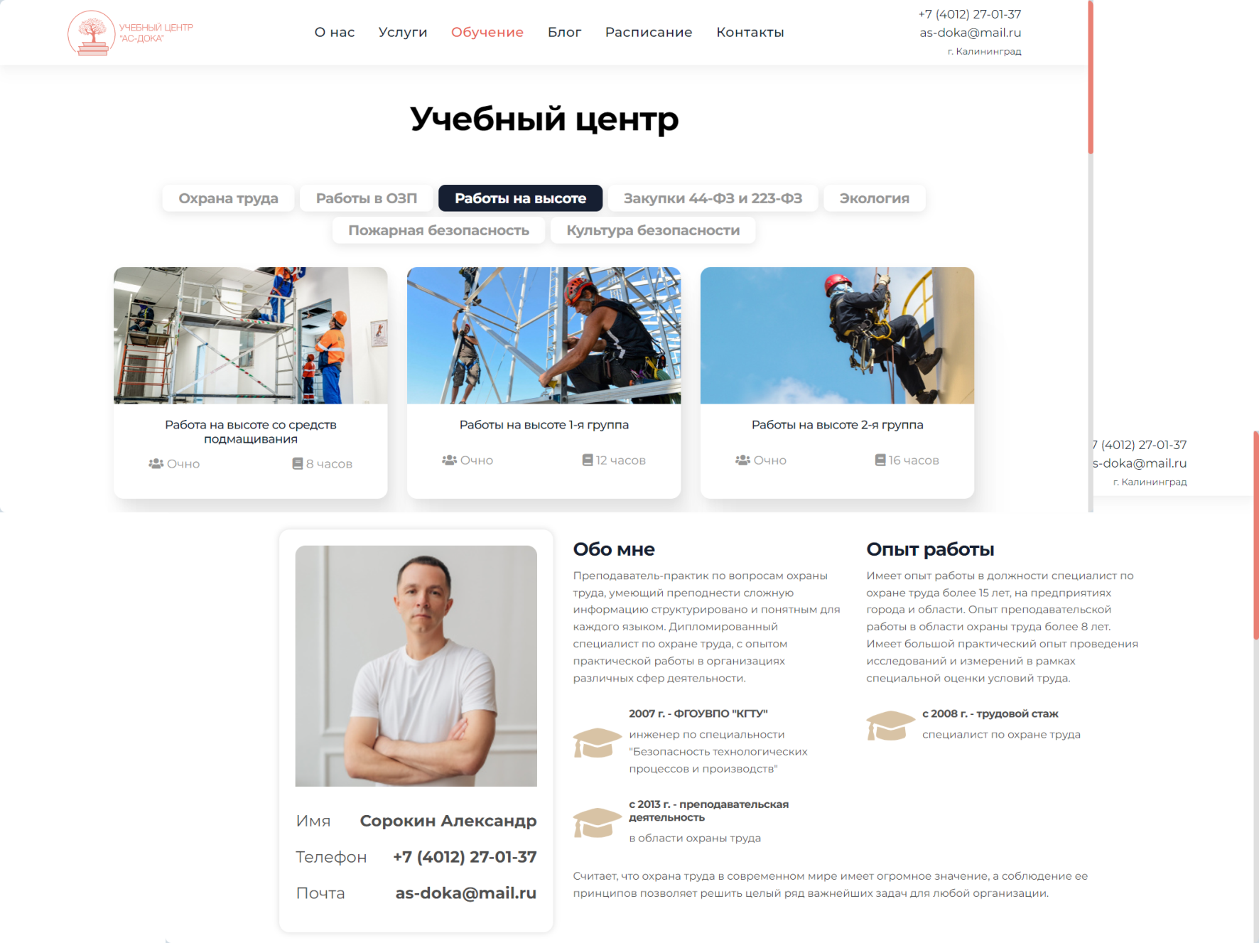 самые важные направления: услуги и учебный центр. Это следующее, что гость сайта видит сразу после главного баннера со скидкой. И если с разделом услуг все стандартно и просто, то раздел учебного центра имеет интерактивный одноуровненый фильтр, который прямо с главной страницы сортирует необходимое направление в обучении. То есть в сам раздел, в общем-то, можно и не заходить, а выбирать нужную программу прямо с главной. В каждой программе есть разворачивающиеся мини-блоки "детали программы": туда вынесены самые важные моменты: срок, цена, количество часов, тип сертификата.
