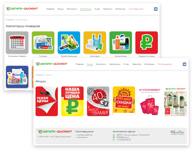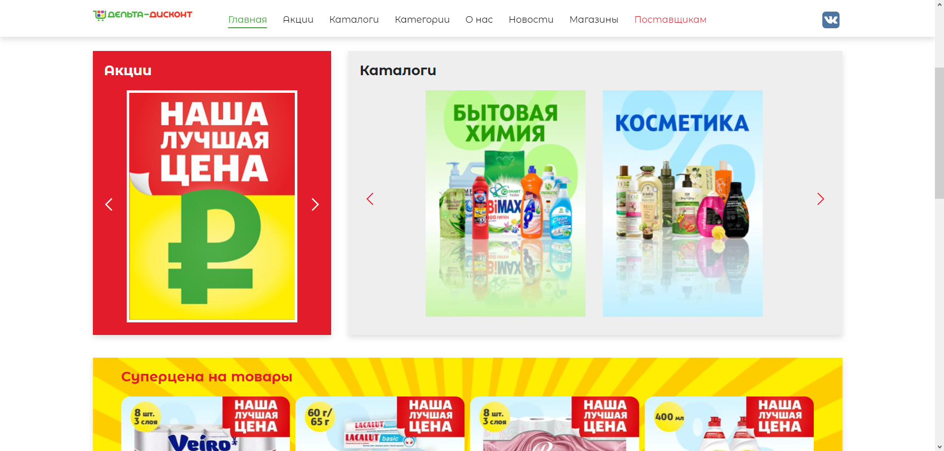 Здесь представлены и все акции, и спецпредложения, разбитые на категории товаров, и каталоги, и суперцены, и раздел "режем цены", также можно скачать любой каталог в формате PDF и подписаться на рассылку акций и каталогов от компании.