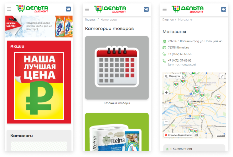 На сайте добавлен раздел с перечнем всех торговых точек сети, где каждый покупатель сможет найти ближайший и наиболее удобный магазин для посещения. Все торговые точки отмечены на интерактивной карте с контактами и адресом магазина, а также эта информация дублируется в общем перечне магазинов.