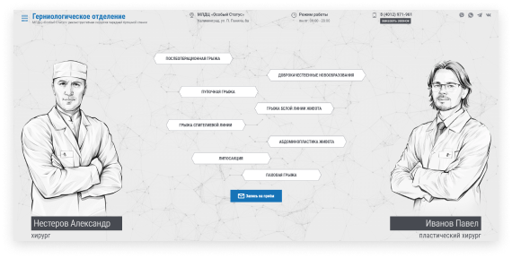 Сайт выдержан в единой тематике направлений центра: лаконичный сдержанный стиль, рисованые портреты ведущих докторов, а также самые "ходовые" направления отделения.