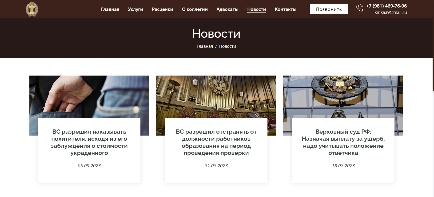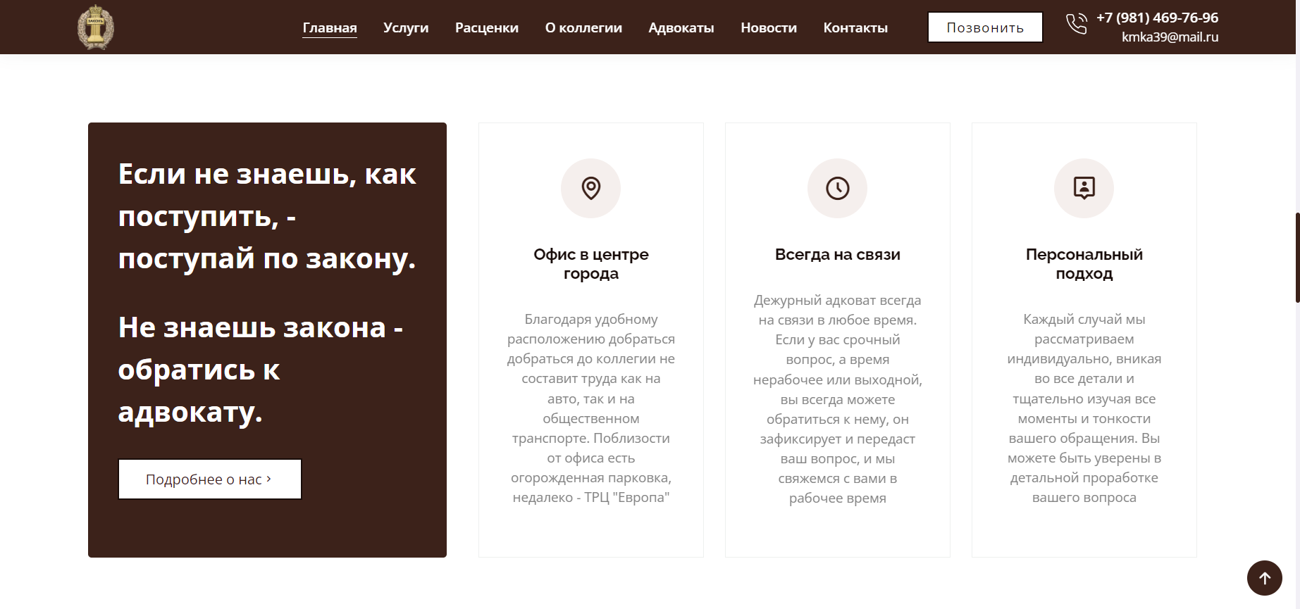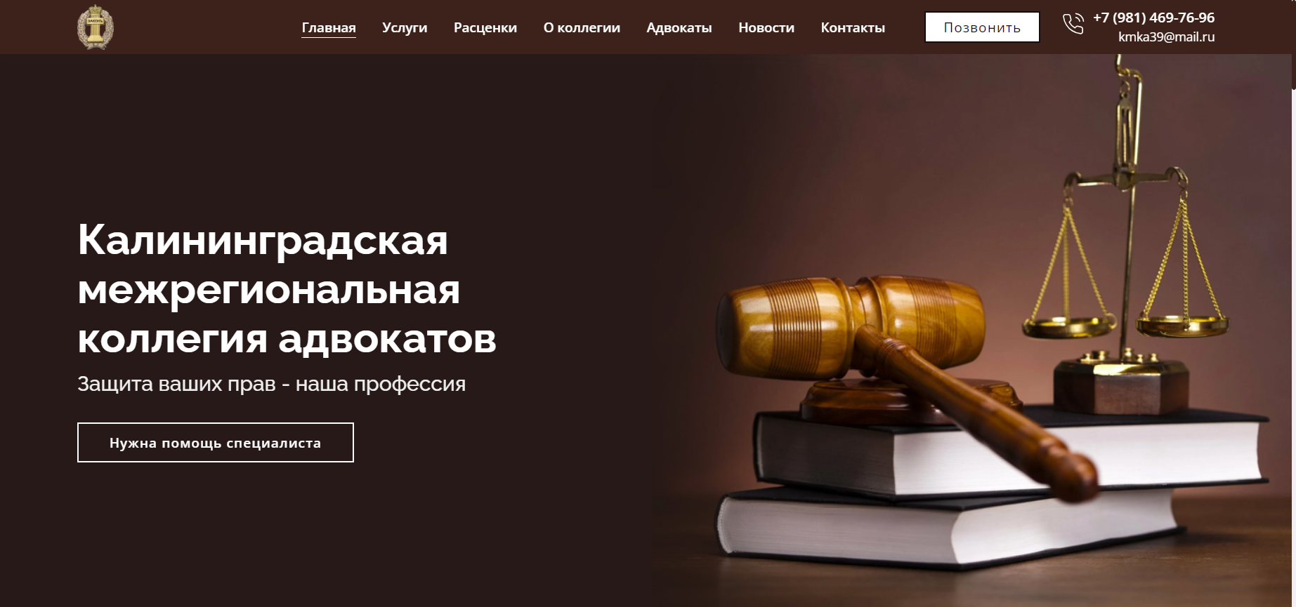 сведения о коллегии, список услуг, перечень адвокатов с подробной информацией по каждому, новостной регулярно пополняемый блок, блок контактов и обязательный нормативный раздел расценок.