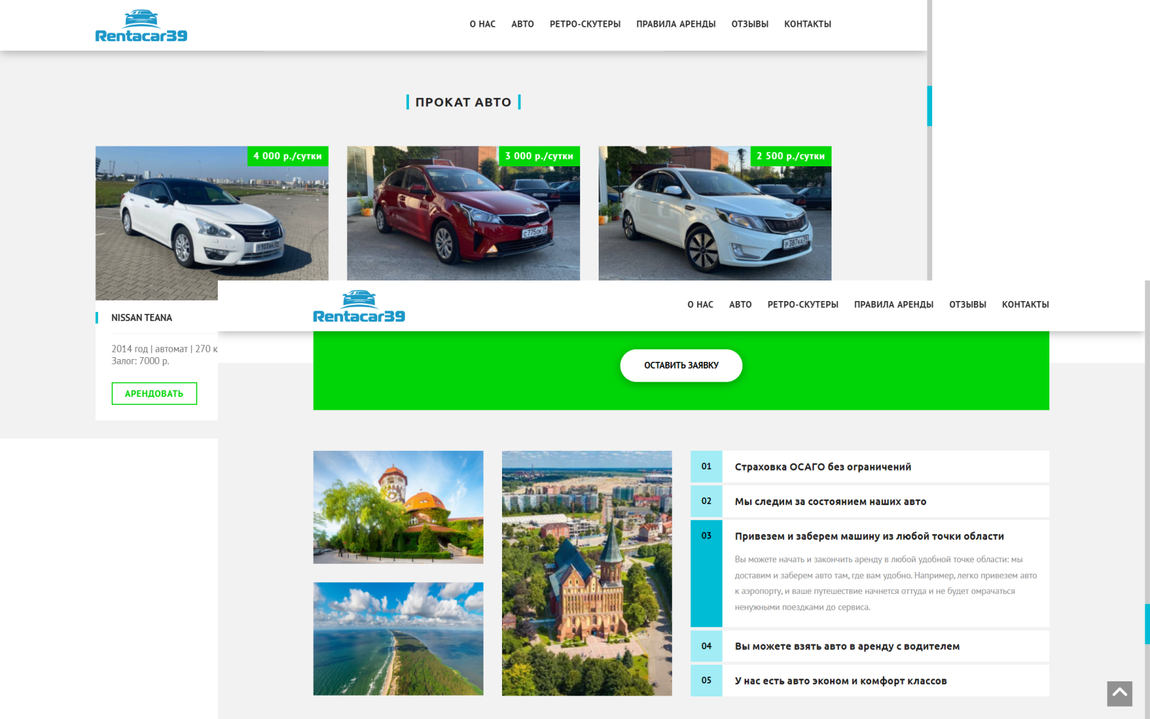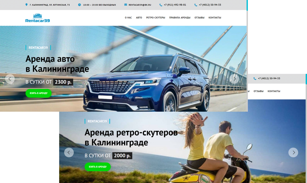 У компании 2 направления деятельности: это посуточная аренда ретро-скутеров и автомобилей разных классов. Нашей задачей было сделать яркий свежий сайт в сине-зеленых тонах и совместить направления в одном
