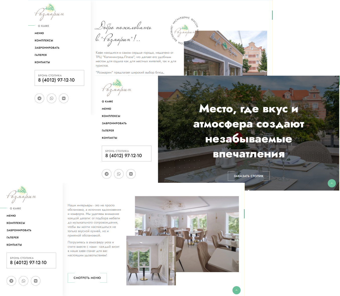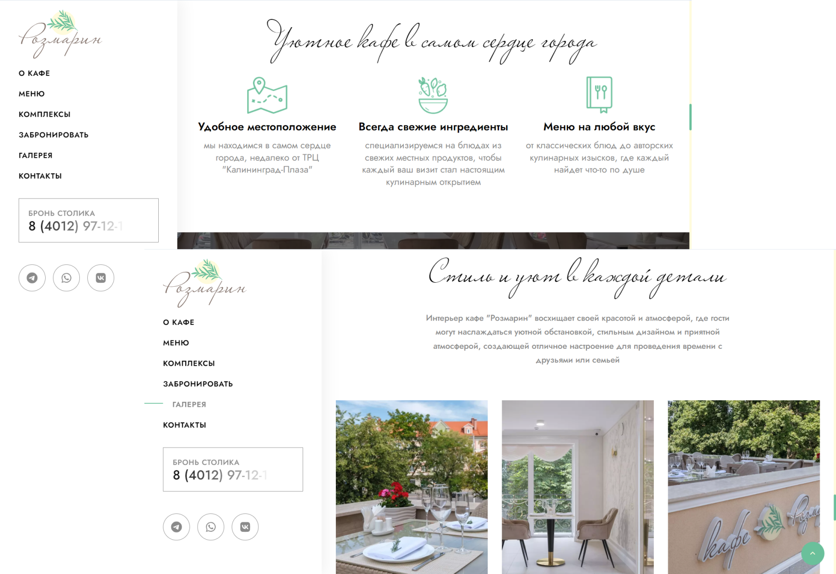 таким образом сайт обретает полностью законченный целостный визуал. Цвета повторяются в элементах сайта - это добавляет изюминку в дизайн: вкрапления пастельного желтого и мягкого травяного зеленого цветов делают сайт теплым и уютным, а общая светлая концепция - легким и стильным, как и интерьер самого заведения.
