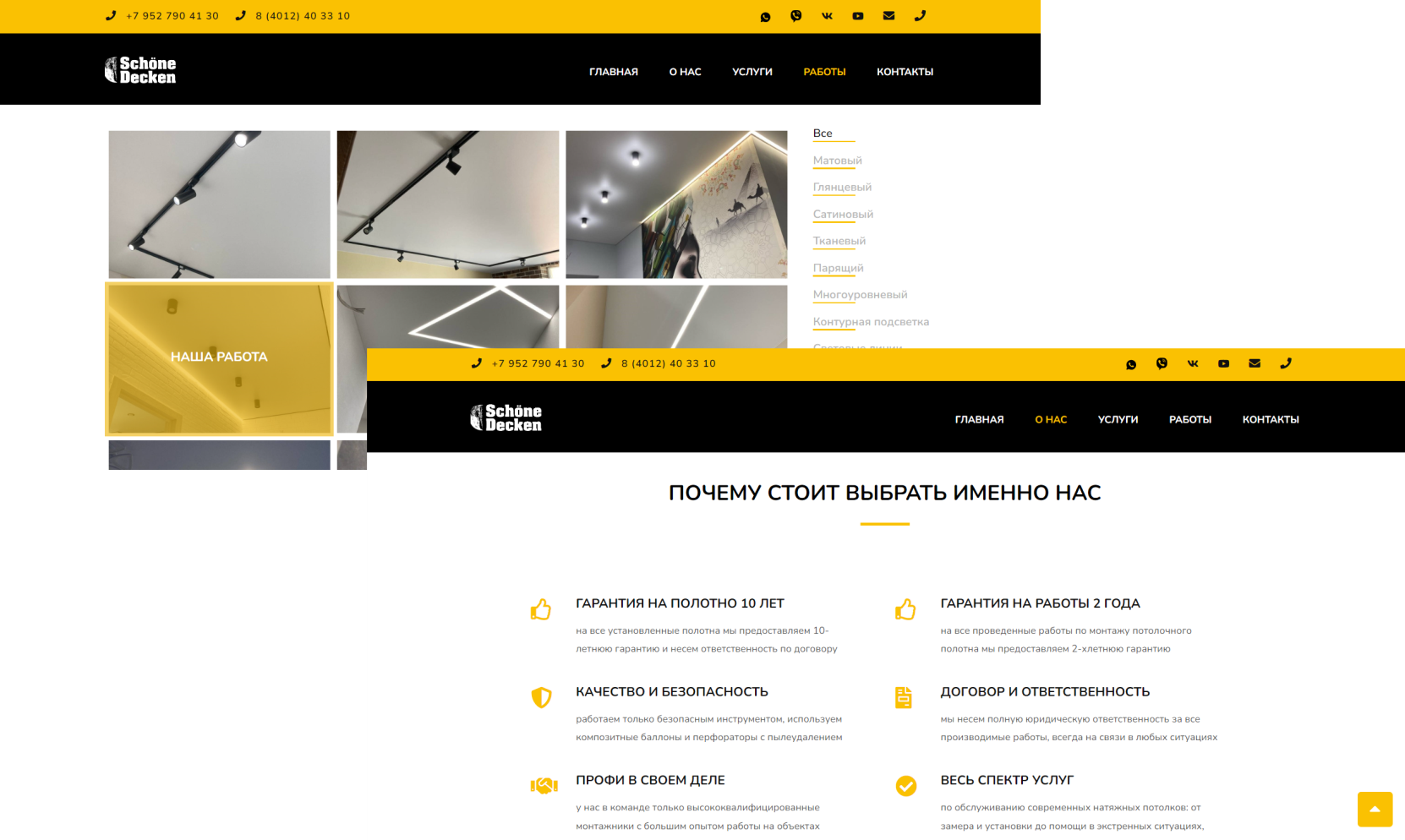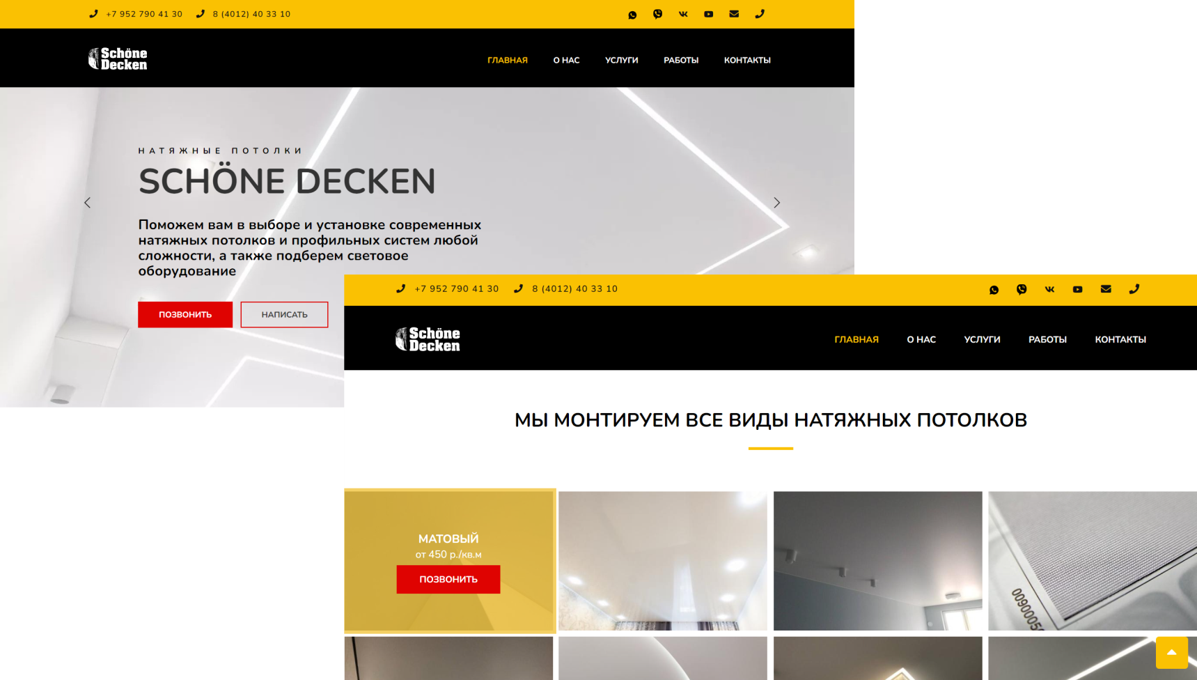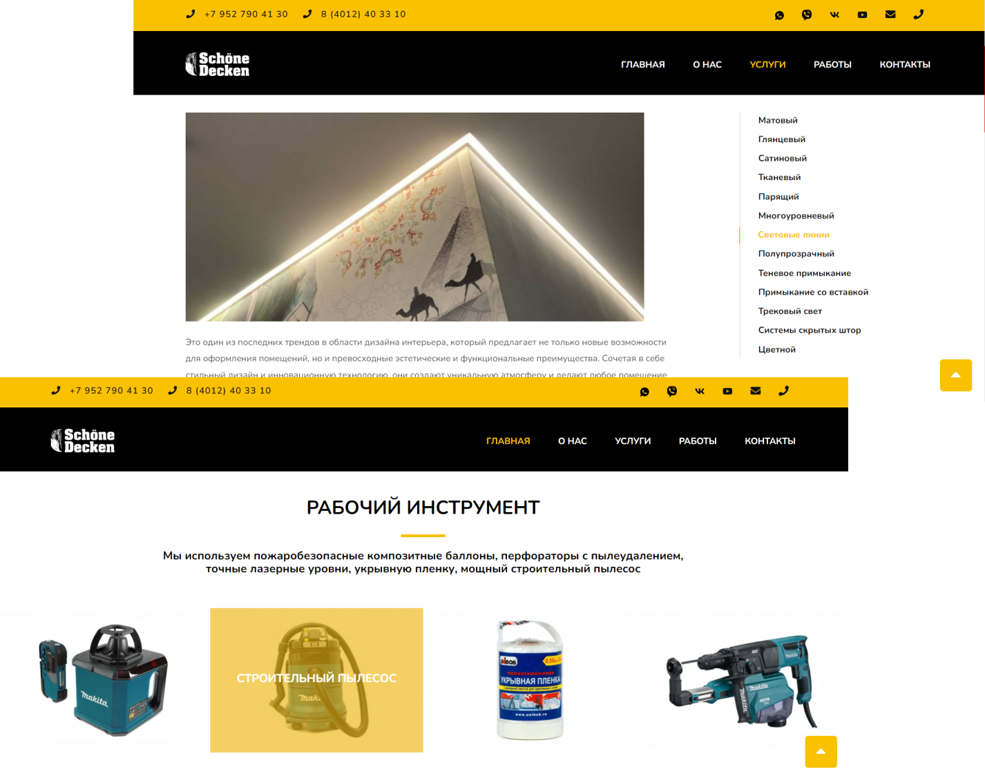 Работы в конце того года было, прямо скажем, много!.. Наконец-то появилось немного времени, так что начинаем потихоньку выкладывать наши новые проекты. Итак, погнали: многостраничный сайт с прицелом на seo для компании по установке натяжных потолков и освещения в Калининграде.